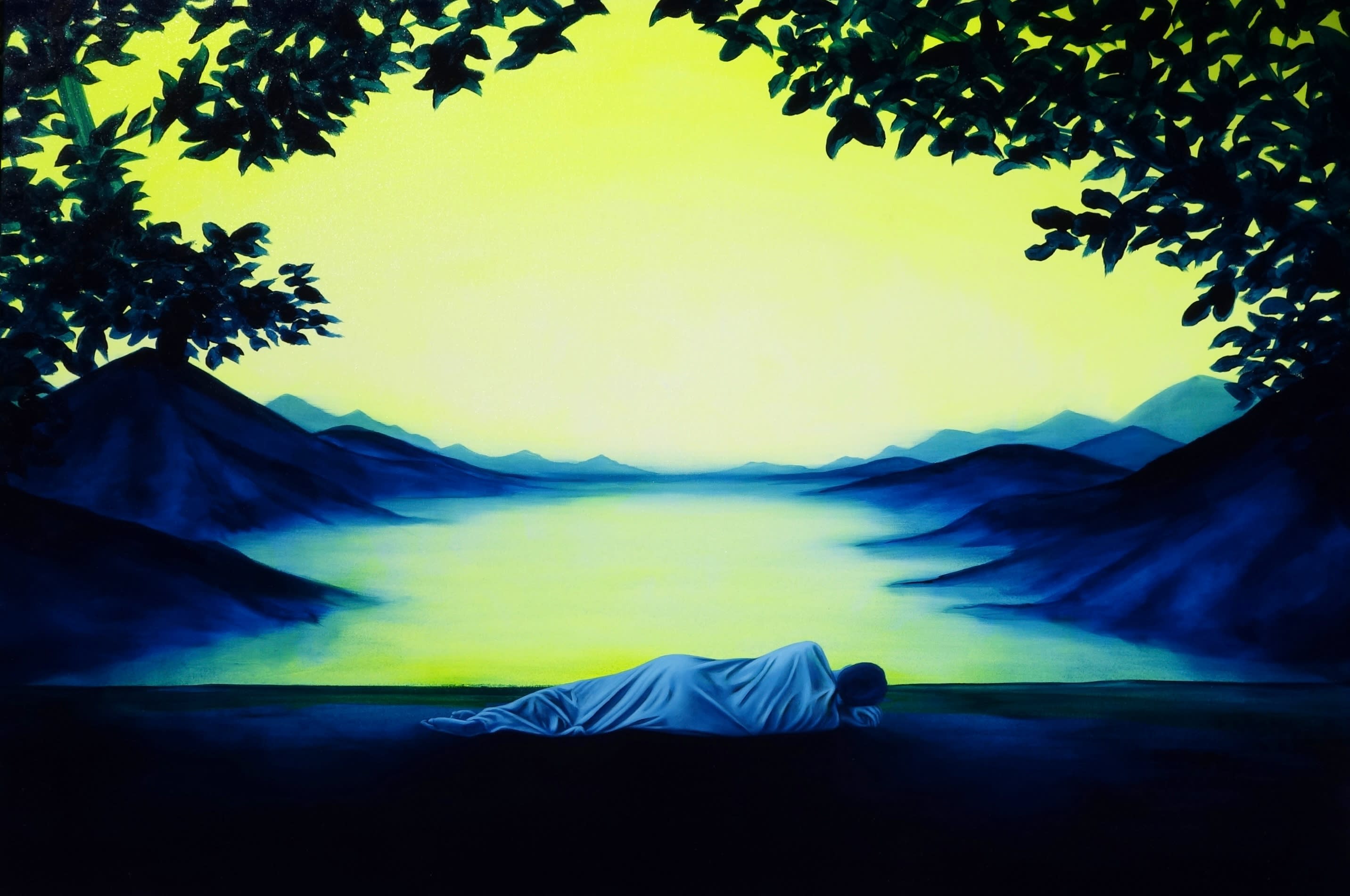 Samo: I ended the residency not with an object or sketch but with a large painting that summarises my time there. A painting I called In Search of Destiny. It’s inspired by Tuscan landscapes, Youssef Nabil, and my self-portrait series titled Dante’s Dream shot in the Cayman Islands last year. This piece encapsulates a sense of peace, isolation, and inevitability. Drifting into the present moment through a more liberated and loose approach, along with a duo-chrome colour palette, this piece emanates serenity through simplicity.